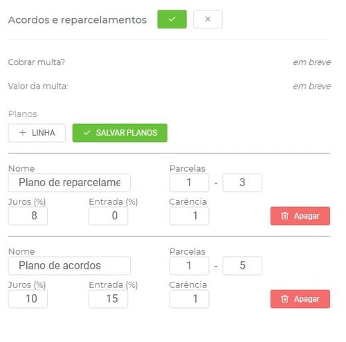 Para fazer acordos e re-parcelamentos, basta realizar uma busca super rápido onde é possível visualizar as faturas atuais, em atraso e as próximas faturas desse cliente. A partir disso, você tem acesso a toda configuração para fazer melhores opções de pagamento para seus clientes, re-negociação e acordos, mudando a quantidade de parcelas anteriores.